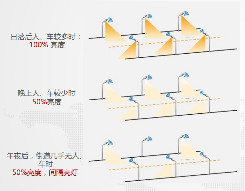 可以設(shè)置特殊的照明控制策略,在節(jié)假日期間或者人流量較大的地段,實(shí)現(xiàn)區(qū)別性的照明計(jì)劃;與其他系統(tǒng)聯(lián)動(dòng),在事故發(fā)生地段加強(qiáng)照明亮度;實(shí)時(shí)指定某些地段的照明亮度。