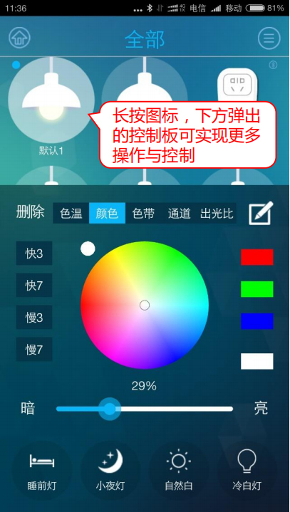藍牙(Bluelooth)無線自組網技術實現互聯,設備與設備之間級聯,實現不受限的網絡覆蓋范圍。這是一種基于藍牙的無線智能照明控制系統(tǒng),其包括智能照明設備、無線控制設備及可控制、配置該照明控制系統(tǒng)的移動端APP軟件。