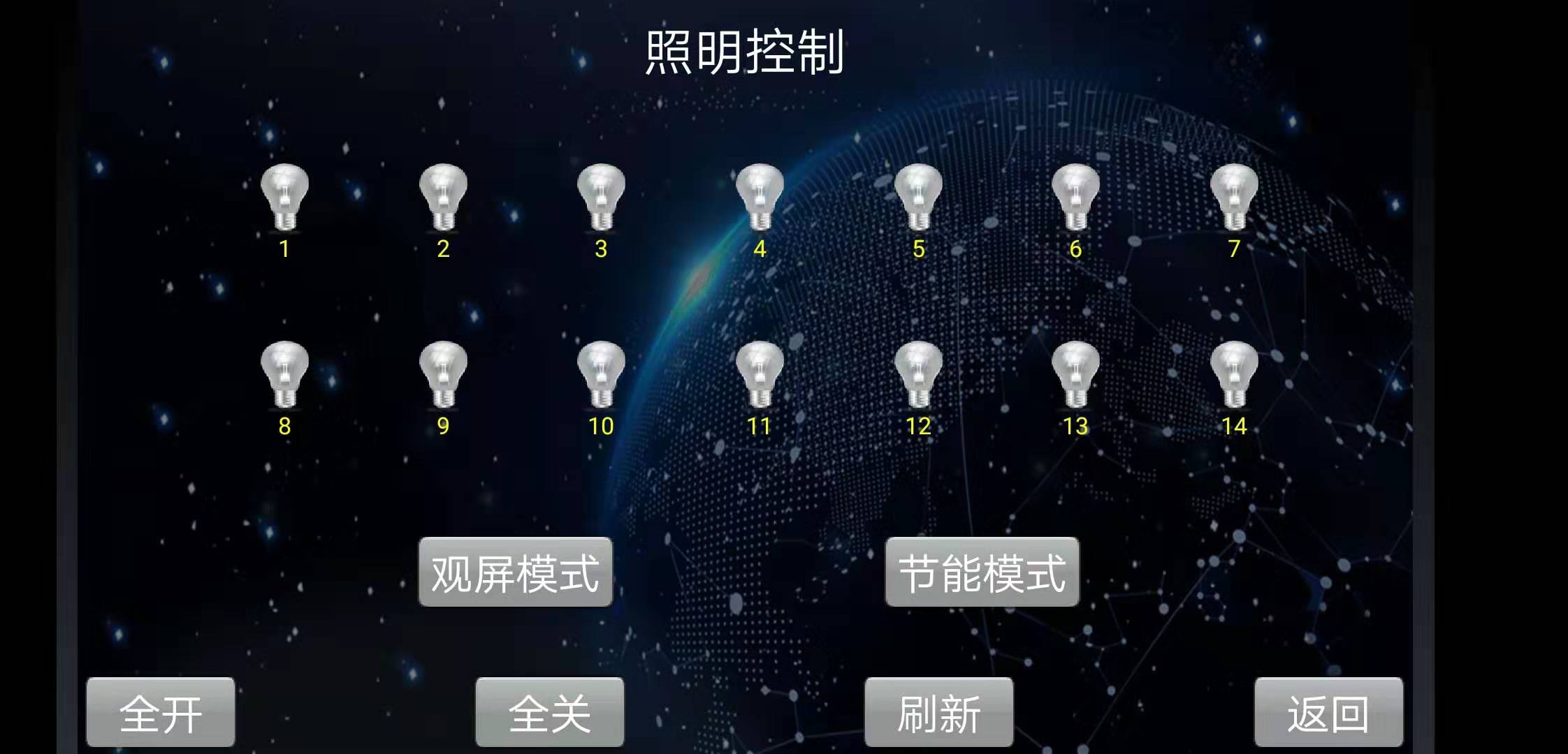 燈具:控制項目內(nèi)的所有燈光照明,每個燈光回路可實現(xiàn)單獨控制,并設計了多種控制場景,如觀屏模式、節(jié)能模式、全開模式、全關模式等,使燈光控制變得更加智能、更加便捷。