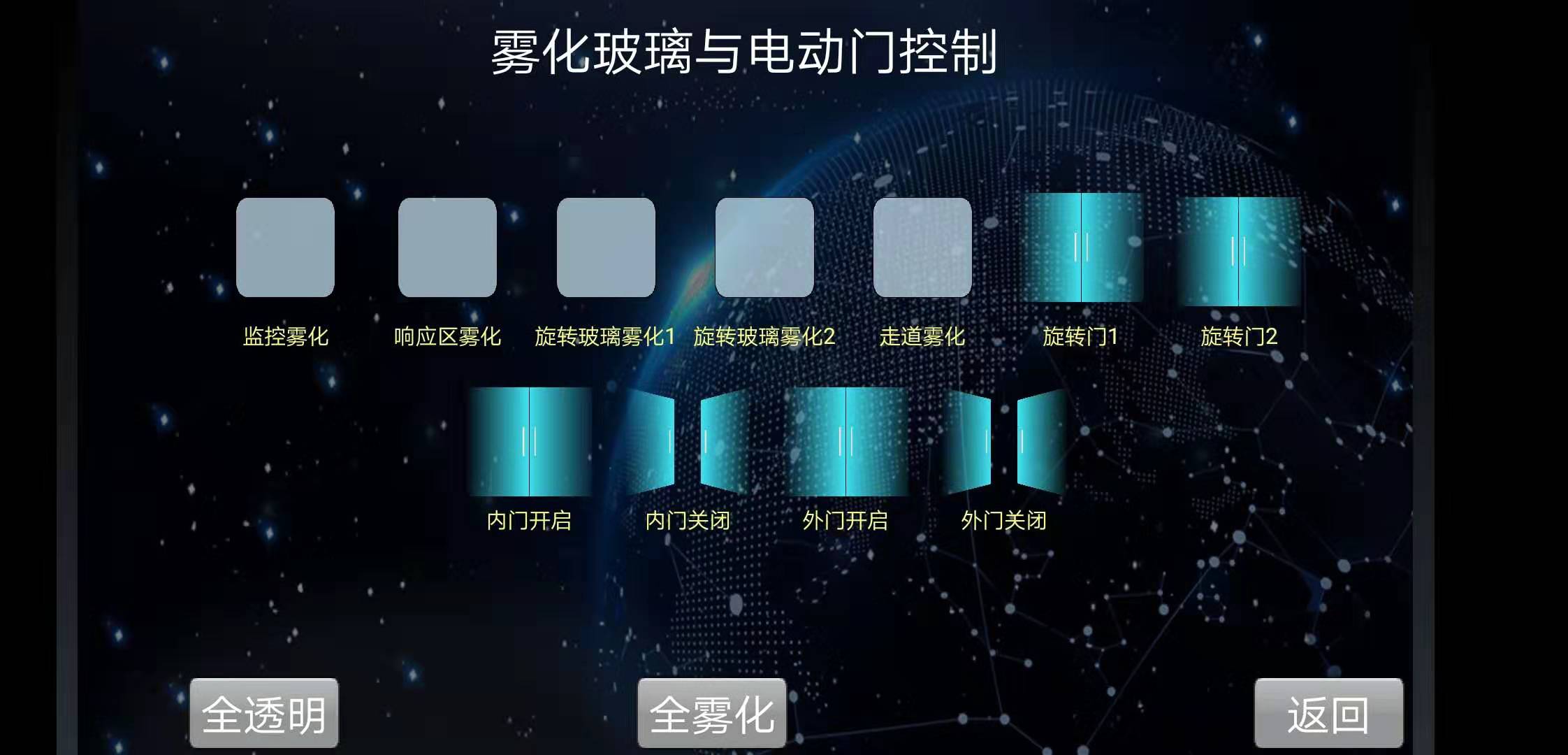 霧化玻璃與霧化玻璃門:調(diào)度中心有五組霧化玻璃,其中兩組為可旋轉(zhuǎn)霧化玻璃門。經(jīng)過技術(shù)對接以后,通過控制霧化玻璃的干接點信號,閉合則控制霧化玻璃門透明,斷開則控制霧化玻璃門霧化。旋轉(zhuǎn)門也同樣控制干接點信號,閉合則旋轉(zhuǎn)九十度,斷開則復原。
