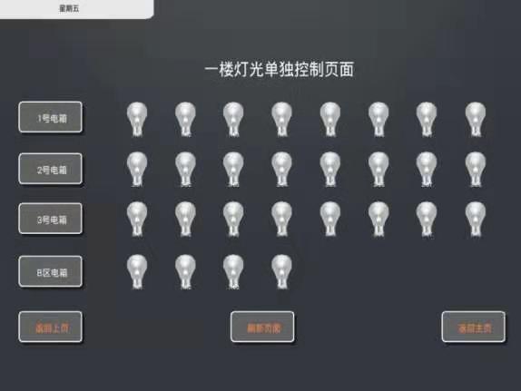 下圖為該項(xiàng)目的智能照明控制軟件截面圖,如圖所示,有電箱內(nèi)的回路單控,也有以樓層為單位作區(qū)域燈光控制的選項(xiàng),以及所有系統(tǒng)內(nèi)的燈光一鍵全開全關(guān)的功能。