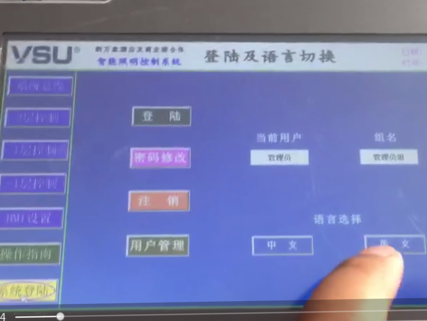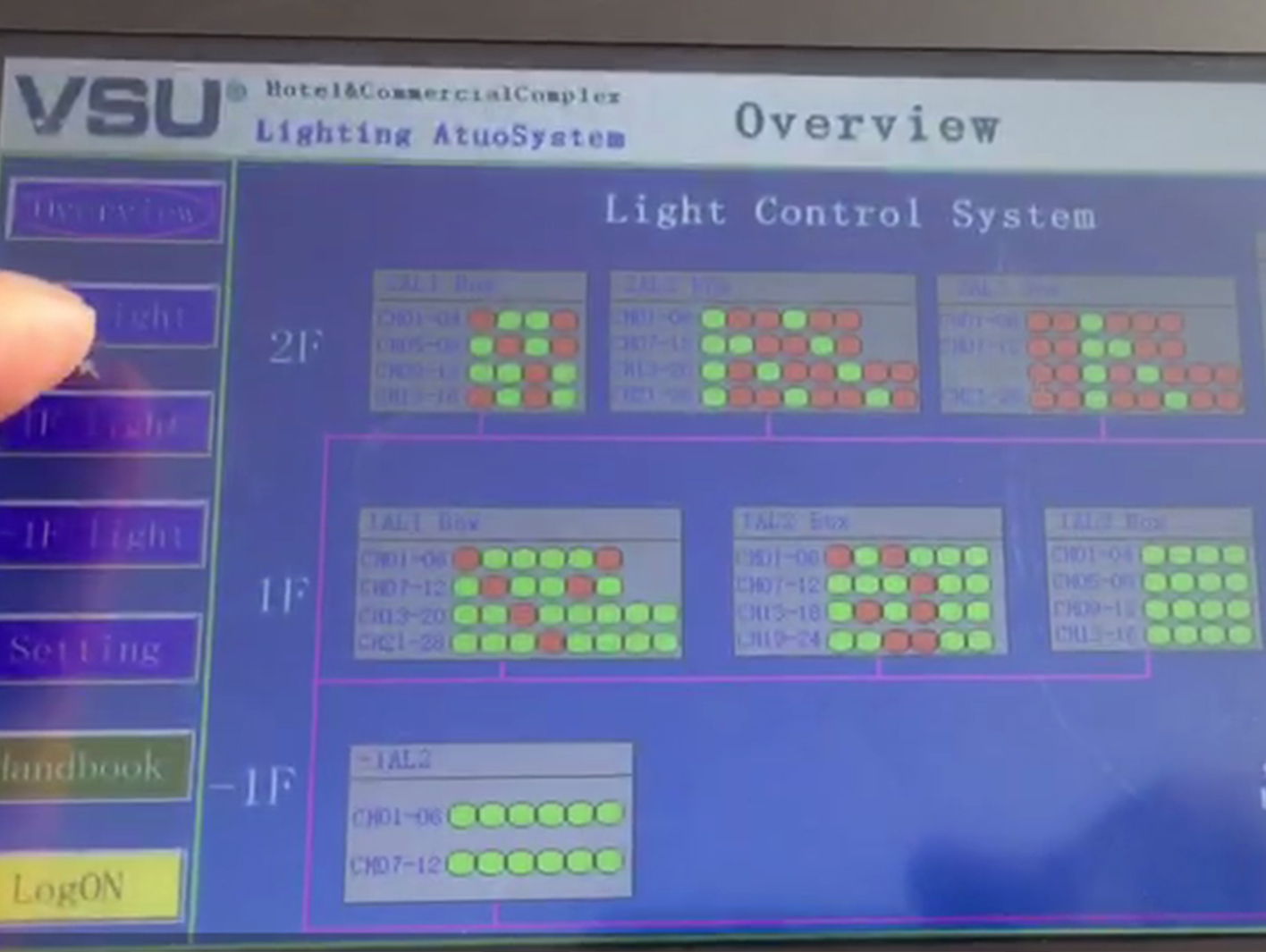上圖為項目現(xiàn)場內的電箱圖片,產品采用導軌式安裝,安裝簡單,普通電工即可完成。通過現(xiàn)場的觸摸屏可對控制終端任意操作,語言選擇中文/English,燈具單控全控,遠程操控。并且可以將建筑內的燈具開關狀態(tài)了如指掌,避免疏忽管理,導致電能耗上升情況的發(fā)生。