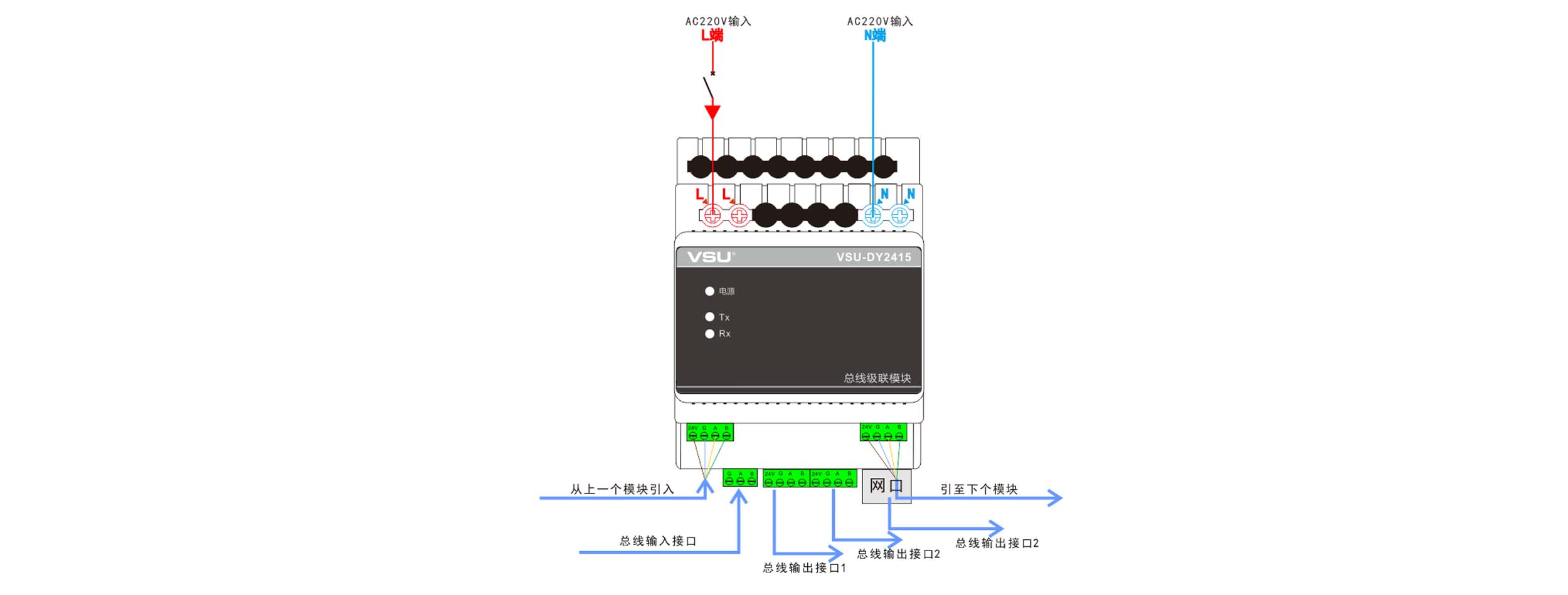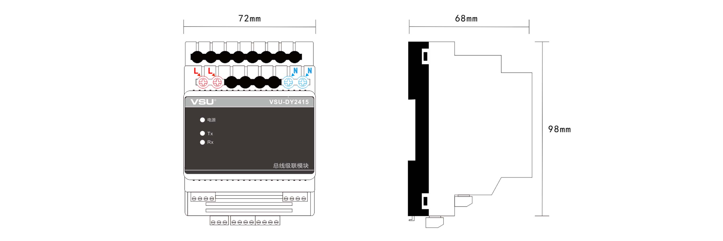 3,導(dǎo)軌式安裝,占4個模數(shù)位,符合VSU-Net總線標準;