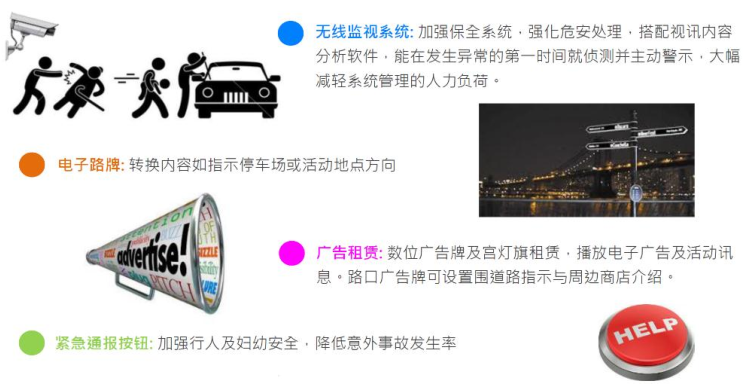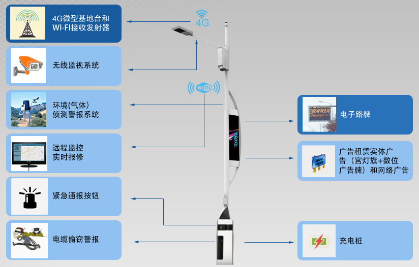 智慧路燈桿是一種集成各種信息設(shè)備技術(shù)創(chuàng)新復合應(yīng)用的智慧路燈產(chǎn)品,整個智慧燈桿內(nèi)包含路燈照明控制系統(tǒng)、WIFI天線基站、視頻監(jiān)控管理、廣告屏播控系統(tǒng)、城市環(huán)境實時監(jiān)測、緊急呼叫系統(tǒng)、水位監(jiān)測、充電樁系統(tǒng)和井蓋監(jiān)測系統(tǒng)等應(yīng)用。