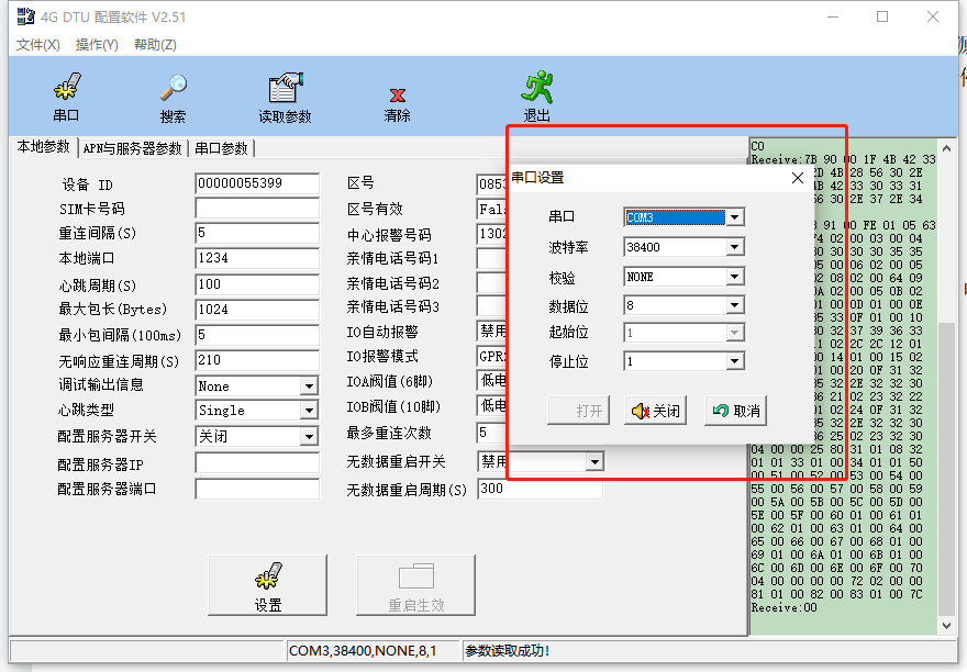首先DTU設備不要上電,準備USB轉RS485通信線接入DTU A B,USB線插入電腦,電腦在設備管理器找到相應COM口,打開軟件4G DTU配置軟件設置相應波特率參數即可,一般波特率設置先38400,設備上電(如果38400找不到設備,應使用19200或9600來交替進行。)具體操作詳見DTU設置說明。